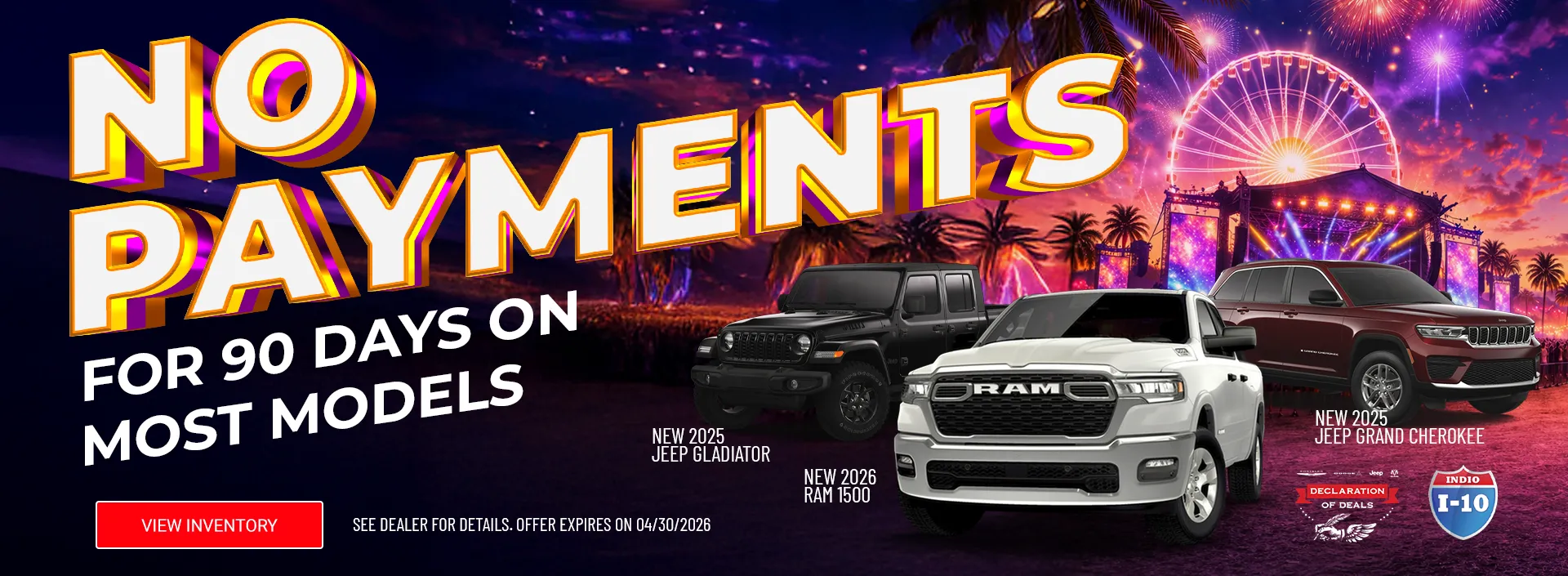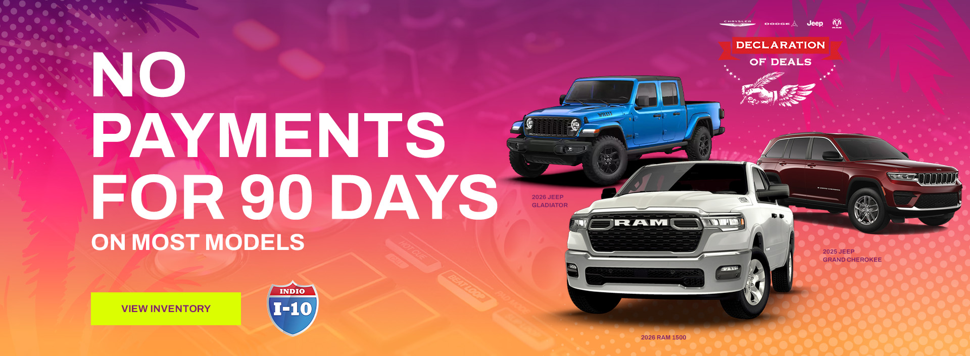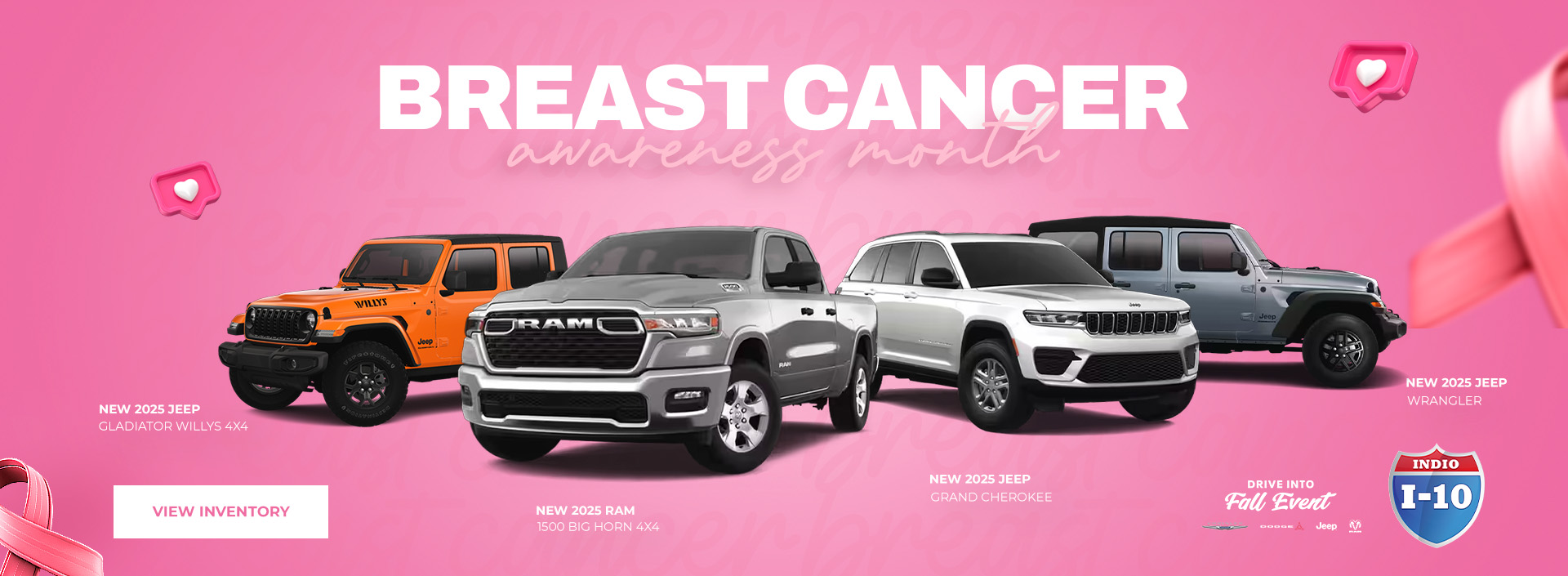 Our new and used Chrysler, Dodge, Jeep, and Ram dealership is conveniently located near the cities of Rancho Mirage, Cathedral City, Palm Springs, Palm Desert, La Quinta, Desert Hot Springs, Thousand Palms, and only ten minutes away from any city in the eastern Coachella Valley.